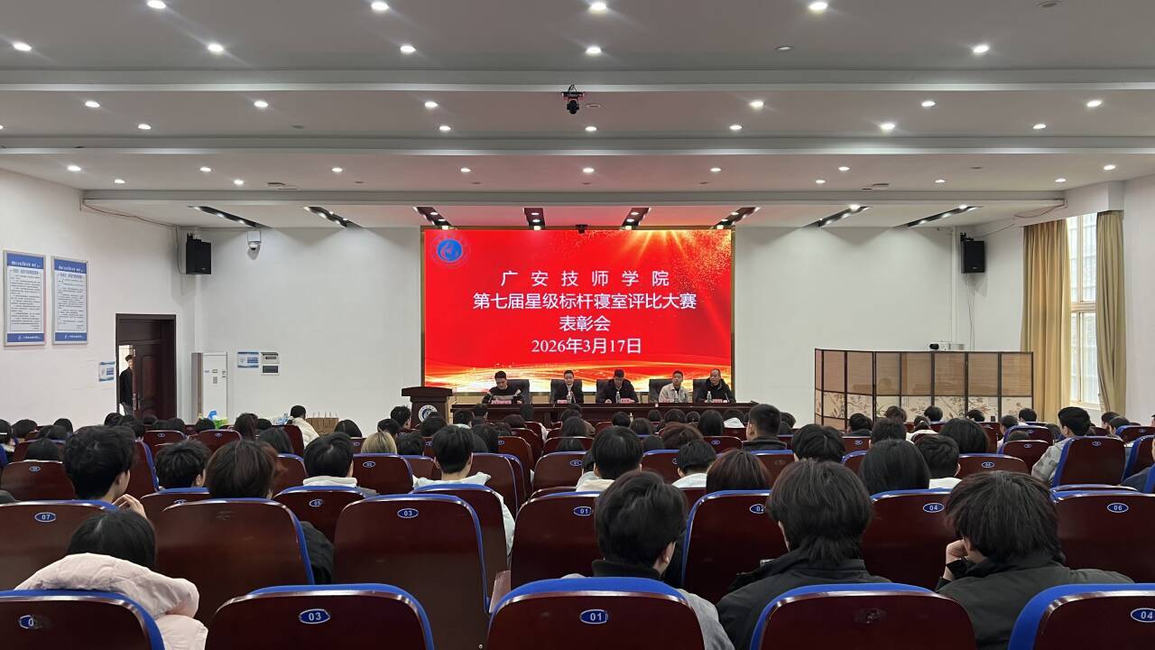 为深入推进文明寝室建设,充分发挥优秀寝室的示范引领作用,3月17日下午,广安技师学院在先圣厅举行了第七届星级标杆寝室评比大赛表彰大会。学院党总支副书记唐元刚、招生与学生工作部全体成员、全体班主任、各班班长、生活委员及寝室长参会。